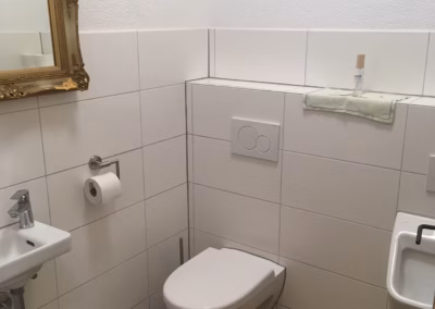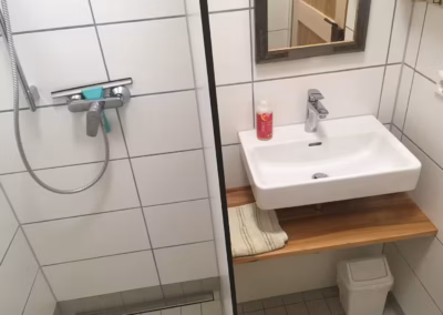 Dusche und Toilette befinden sich im angrenzenden Bio-Markt-Gebäude mit separatem Eingang, nur wenige Schritte vom Schäferwagen entfernt.